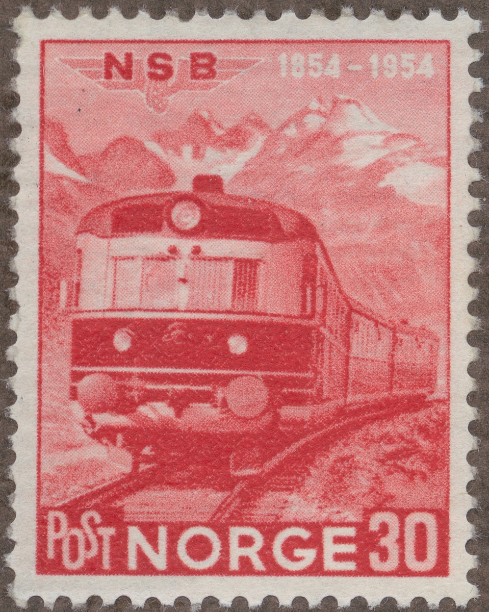 Frimärken ur Gösta Bodmans filatelistiska motivsamling, påbörjad 1950. Frimärke från Norge, 1954. Motiv av Modernt snälltåg: Diesel-Lokomotiv "Norges järnvägar 100 år: 1854- 1954."
