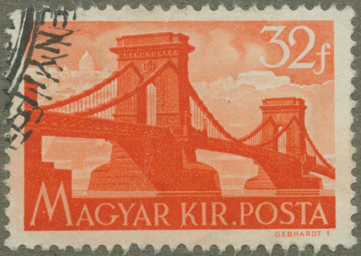 Frimärke från Ungern, 1941. Motiv av Hängbro över Donau i Budapest, Ungern.