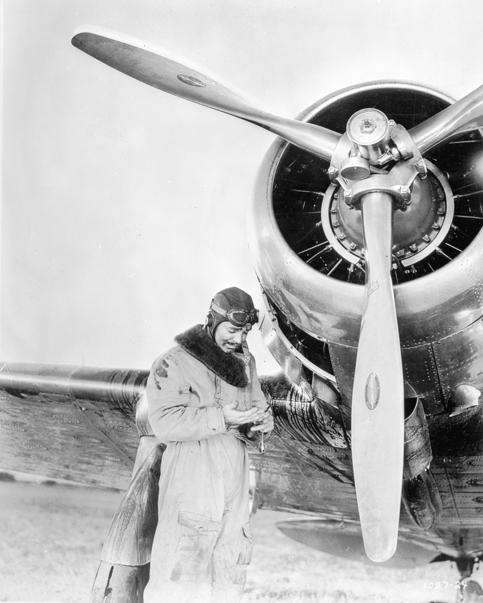 Provflygare vid ett Serversky P 35 J 9. Här har ett oljerör brustit under de naturliga påfrestningarna och tvingat provflygaren att nödlanda.
