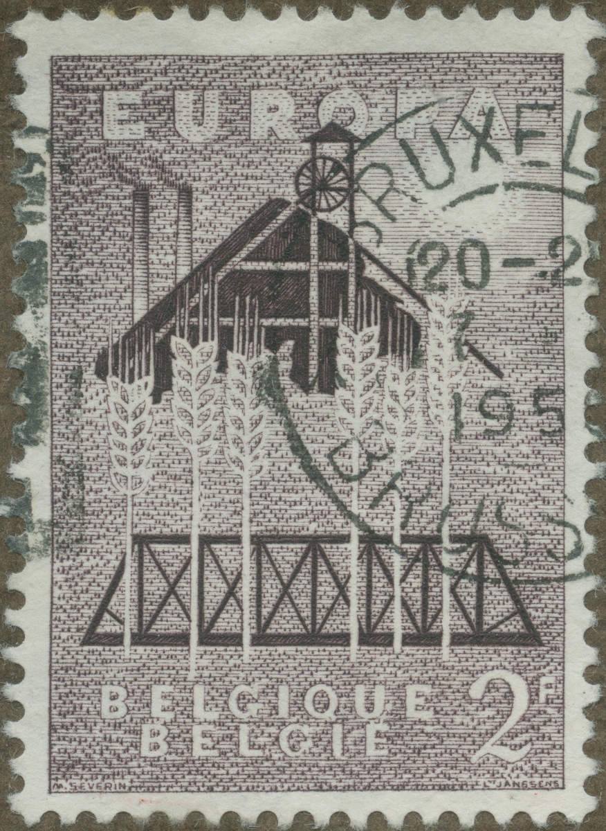 Frimärke ur Gösta Bodmans filatelistiska motivsamling, påbörjad 1950. Frimärke från Belgien, 1957. Motiv av Symbol för Europas industrier.