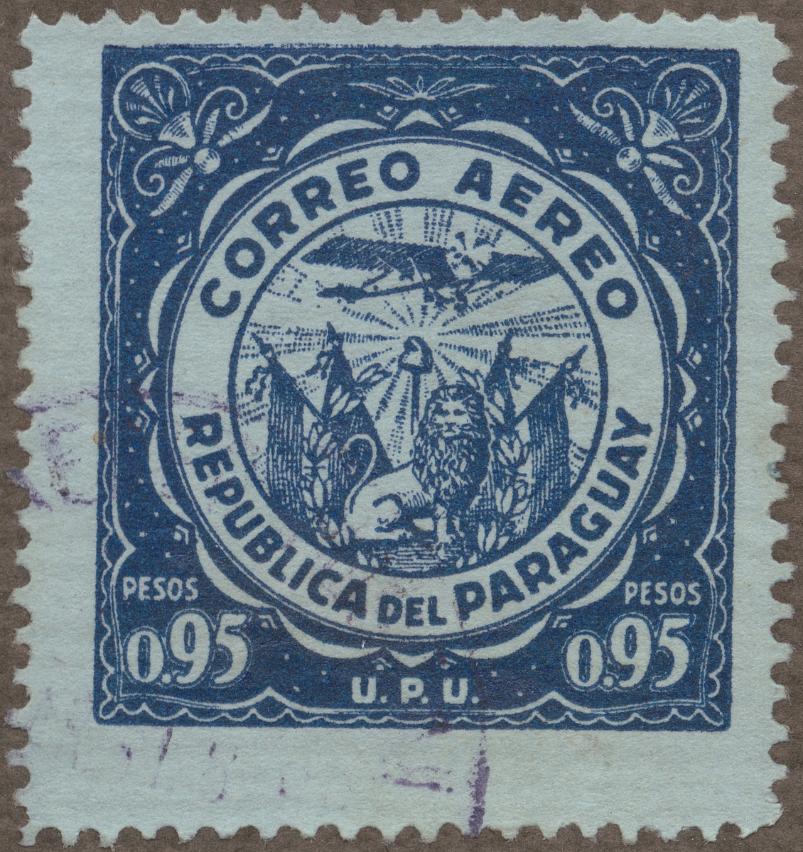 Frimärke från Paraguay, 1929. Motiv av Enmotorigt flygplan över vapen: lejon, Jacobinmössa och flaggor