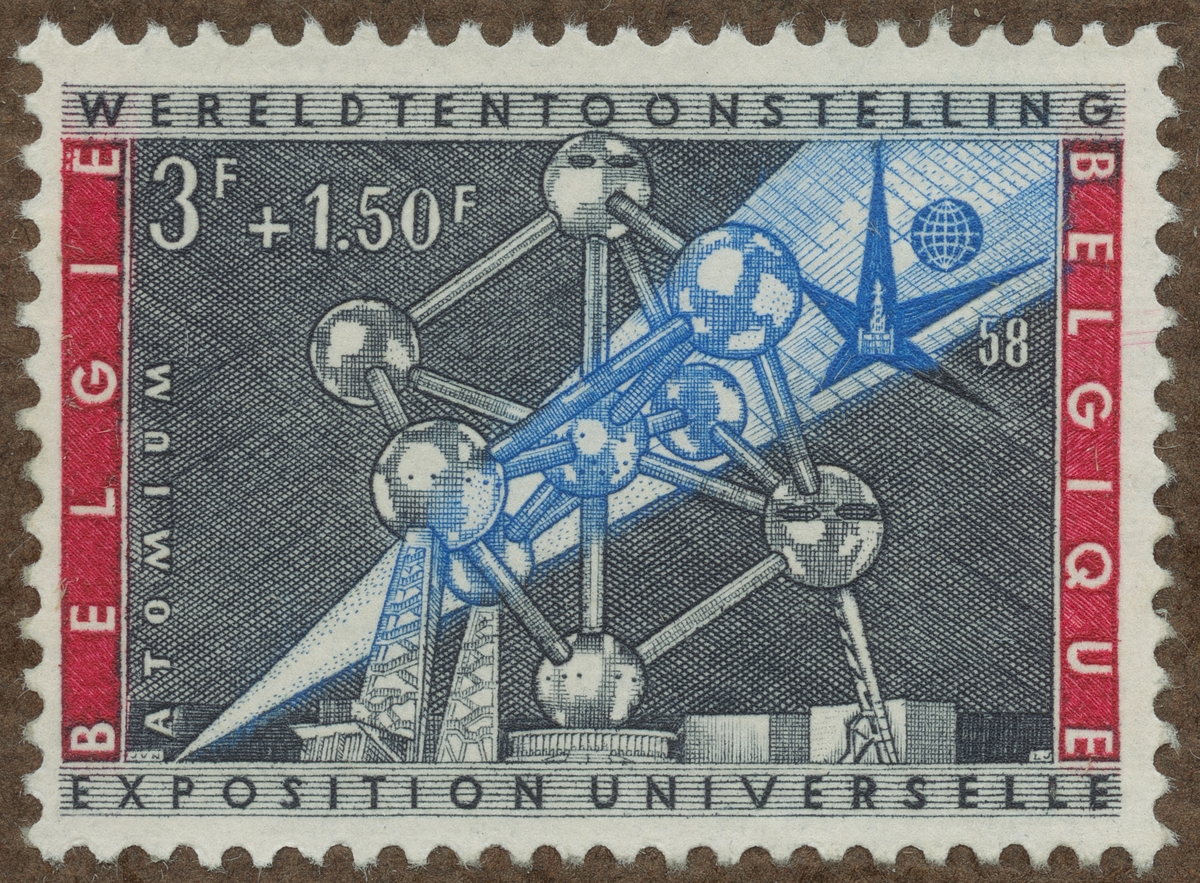 Frimärke från Belgien, 1957. Motiv av Utställningen i Brüssel 1958 "Atomium" C:a. 100 m. högt