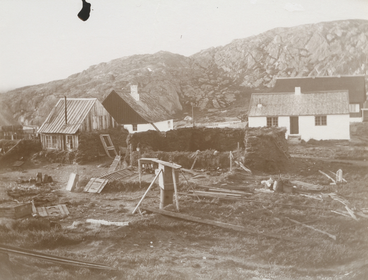 Fotografi från expedition till Grönland. Motiv av fyra hus nedanför ett berg.