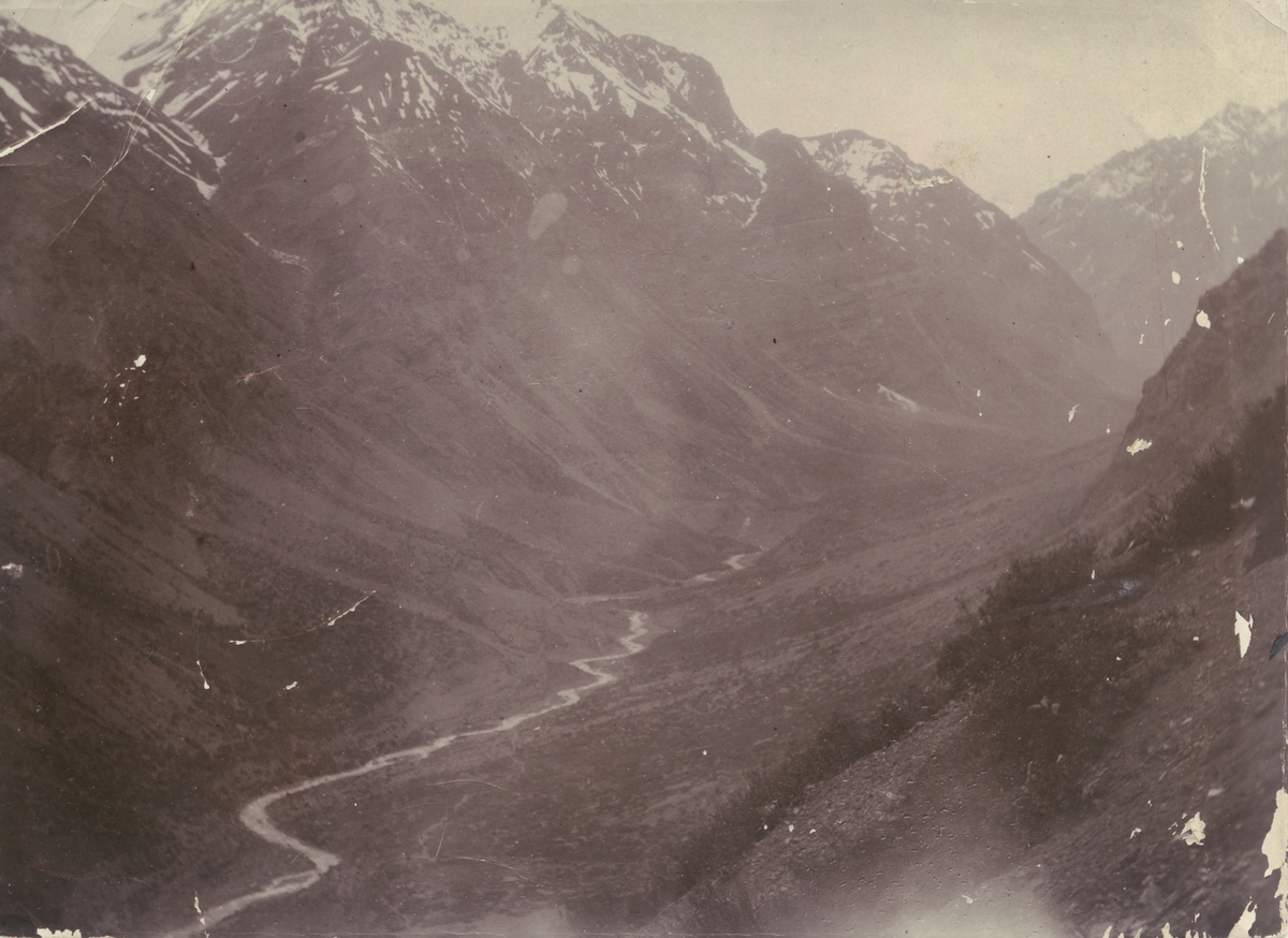 Diverse bilder ur Fred Goldbergs samling. Vy över snötäckta berg och flod.