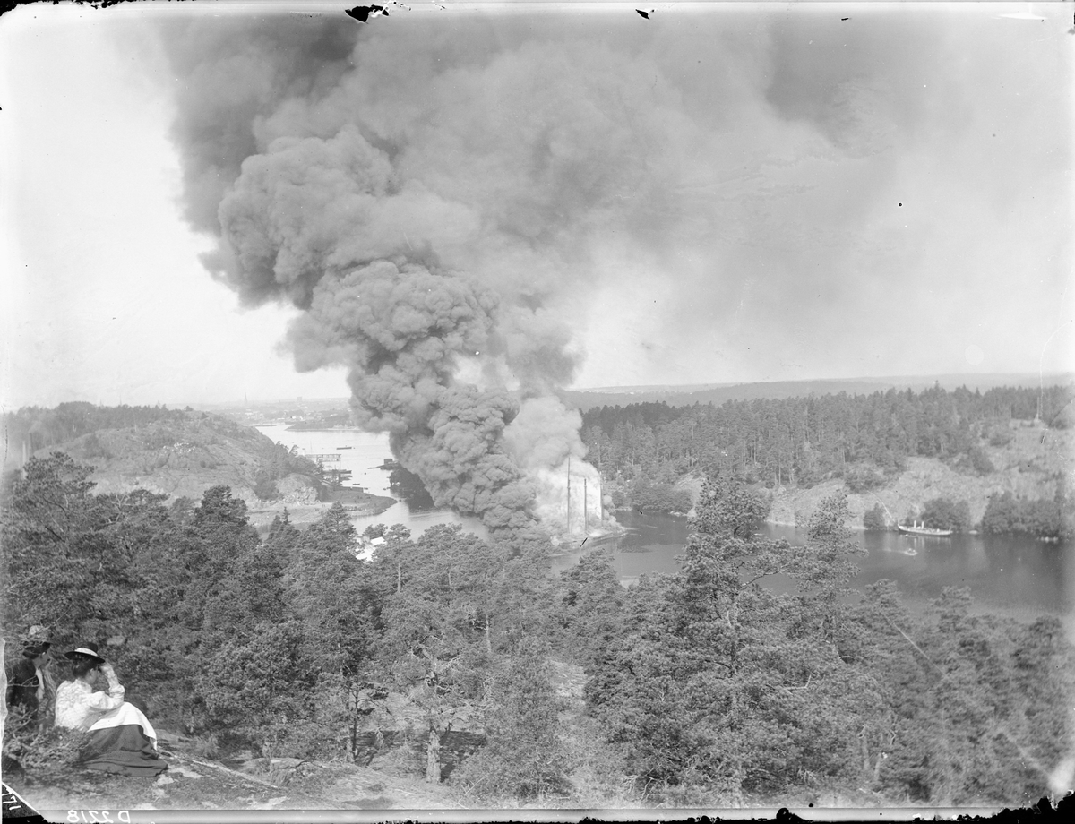Skeppet "Louise Adelaides" explosion i Gäddviken den 23 juli 1901. (Explosionen skedde 08.25 f.m. och fotografiet togs kl 0930 f.m.).