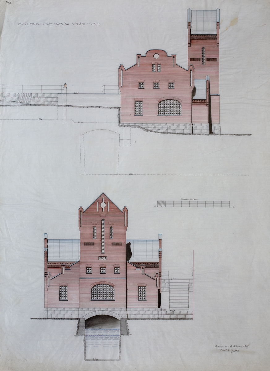 Ritning över vattenkraftanläggning vid Ädelfors.