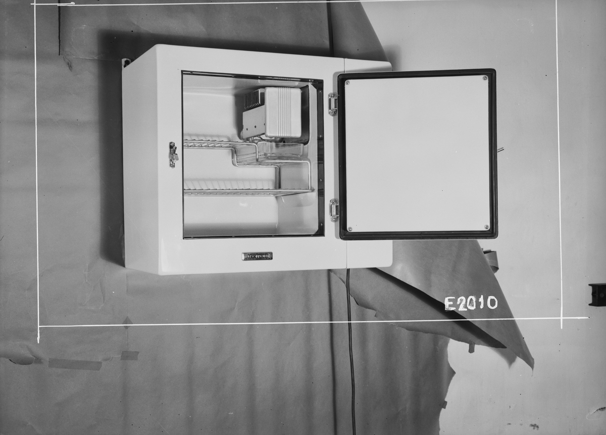 Förslag till "HSB-skåp", öppet. 1,5 kubikfots upphängningsskåp med sidoapparat. Utarbetades under år 1939. Har icke kommit i produktion.