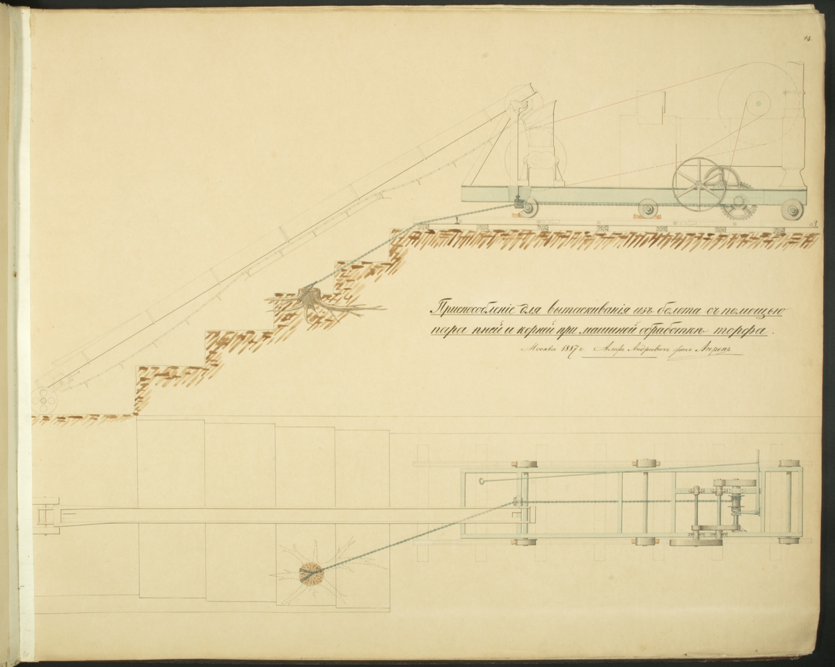 Skiss på ryska , ur boken med ritningar mm 1868-1887, av den svenske torvmaskinkonstruktören Aleph Anrep.