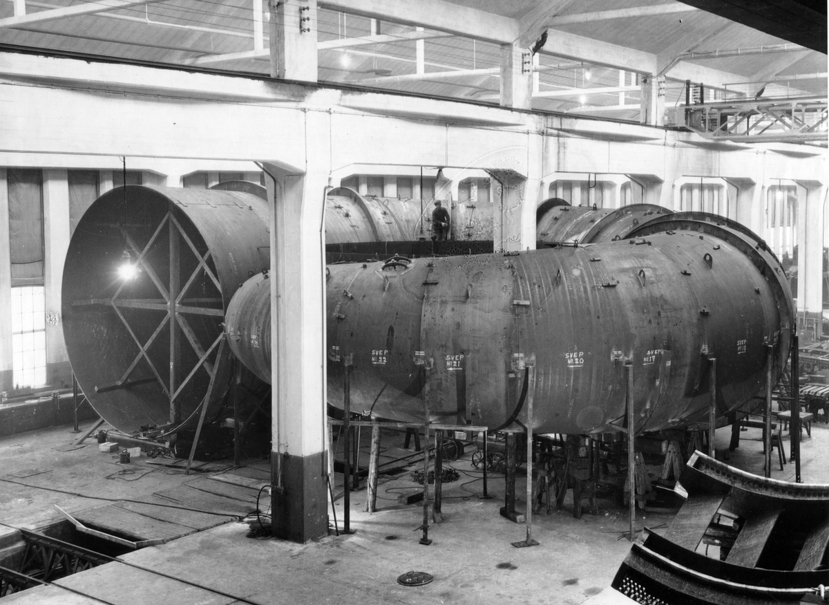 Elektriska maskiner. Interiör från plåtslageriet. Hopsvetsat spiralskåp för kaplanturbin till Trollhätte kraftverk, Hojumstationen. Inloppets diameter ? Turbinens effekt 61 000 hk vid 31 m fallhöjd.