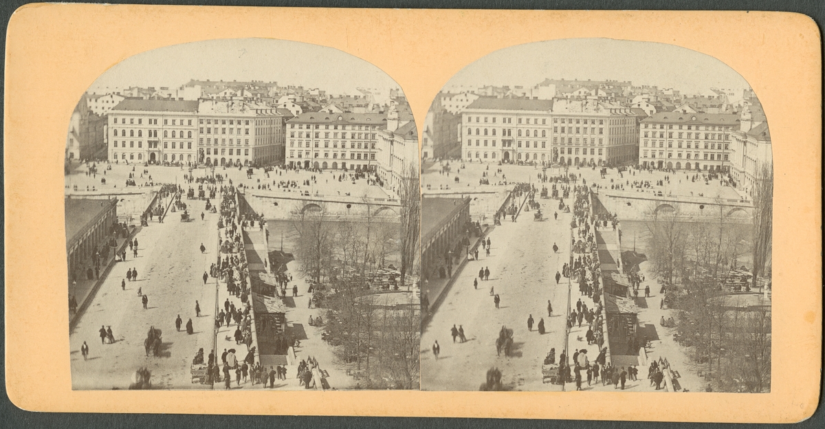 Stereobild med Stockholmsvy. Vy över Norrbro mot Gustav Adolfs torg. Möjligen vid tiden för Industriutställningen 1866.