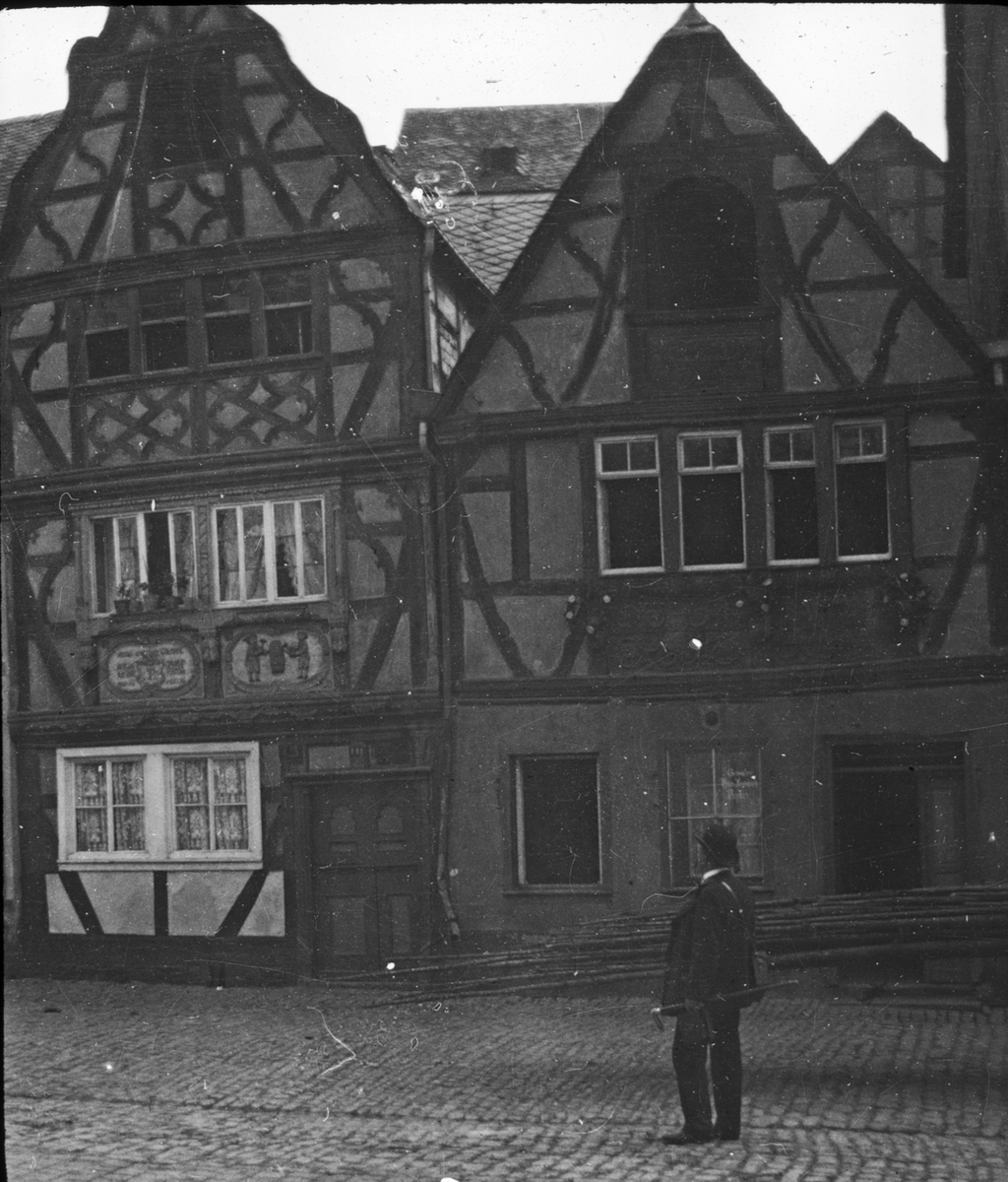 Skioptikonbild med motiv av man framför korsvirkeshus i okänd ort i Tyskland.