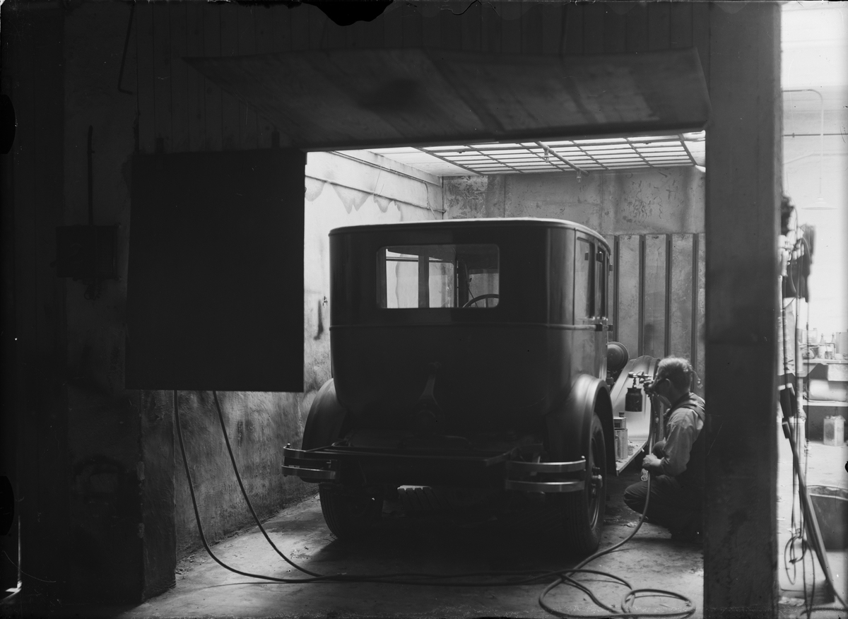 Bild från arbetsplatsdokumentation utförd av Arbetarskyddsstyrelsen. Lackering av bil, okänd verkstad.