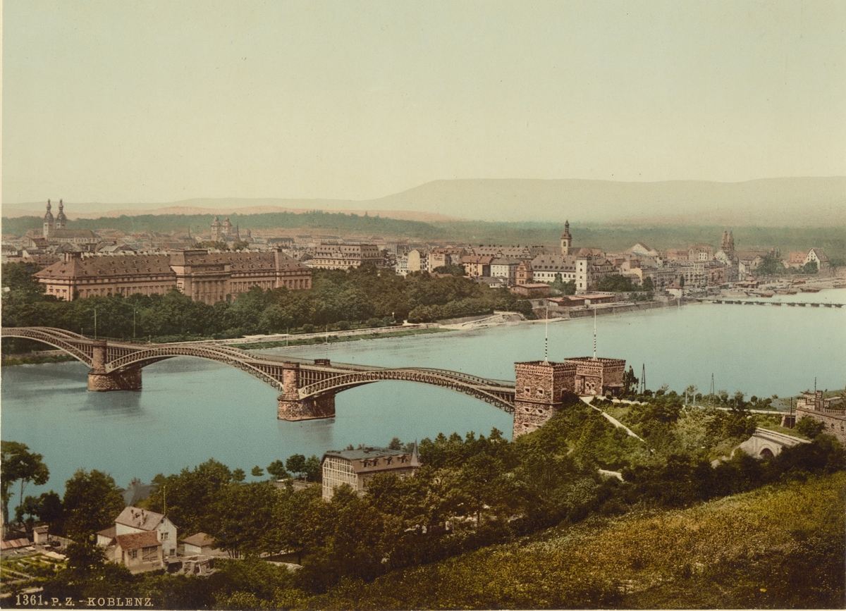 Ur album: Utländska Resan 1900 I. Handkolorerat fotografi. Vy över Koblenz.