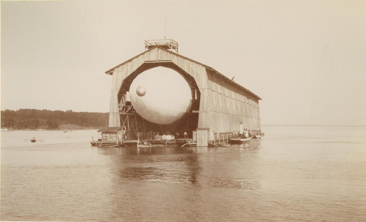 Ur album: Utländska Resan 1900 I. Greve Zeppelins luftskepp vid Friedrichshafen.