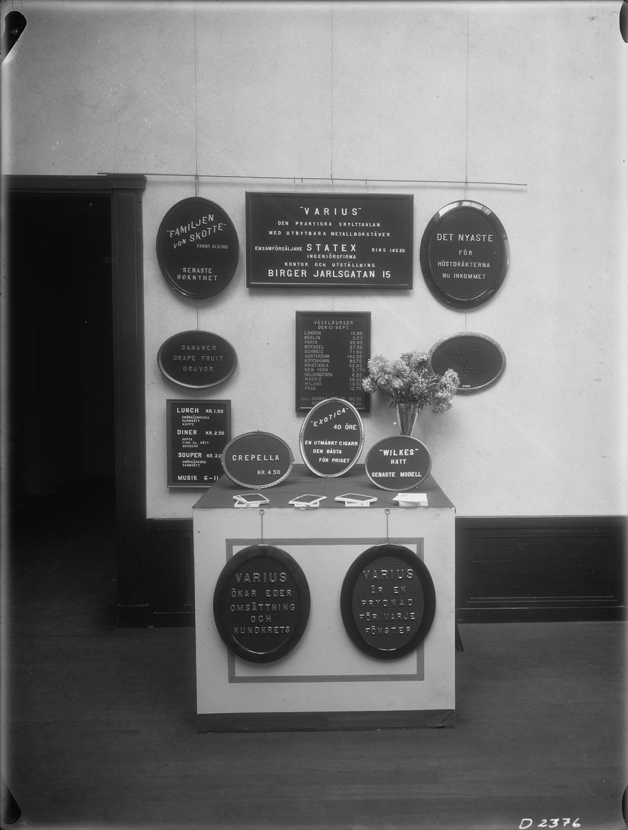 Hantverkets propagandautställning: "Varius" den praktiska skylttavlan. Anordnare Stockholms stads verkstadsskolor.