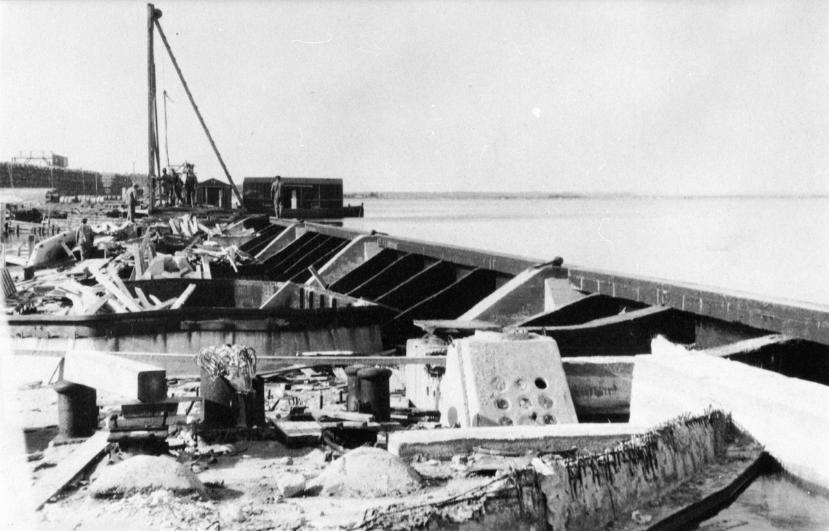 Byggherre: Byggnadsaktiebolaget Contractor, Stockholm. Betongfartyg till kaj.