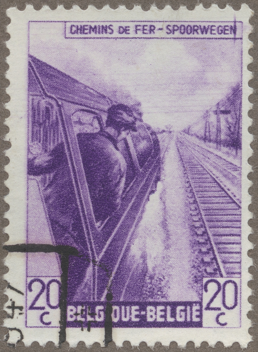 Frimärken ur Gösta Bodmans filatelistiska motivsamling, påbörjad 1950. Frimärke från Belgien, 1942. Motiv av Belgisk lokförare med handen på ventilen