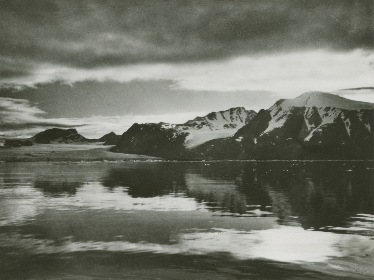 Fotografi från låda märkt Bernt Balchen. Balchen var norsk-amerikansk flygare, polarforskare och militär. Motiv av hav, snötäckta berg och dramatisk himmel på Svalbard.