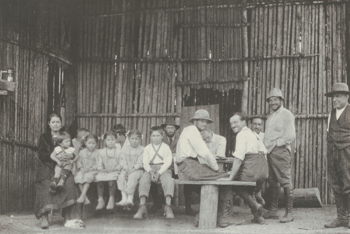 Fotografi från kuvert märkt med "Ernst Nordenskjöld". Motiv av ett antal män, en kvinna och flera barn.