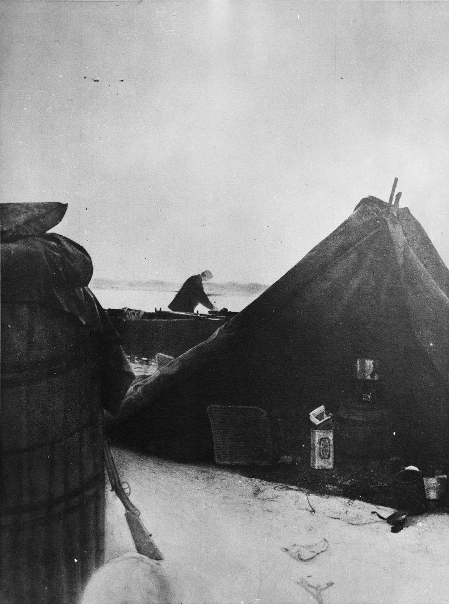 Lägret vid "Örnens" landningsplats. Till vänster gondolen, till höger tältet. Mellan dem skymtar båten. I tältet ses proviant och kokkärl. I mitten kokapparat och till vänster en proviantkorg. Framtagning av bilderna gjordes av docent John Hertzberg år 1930 på Fotografi, Tekniska Högskolan.