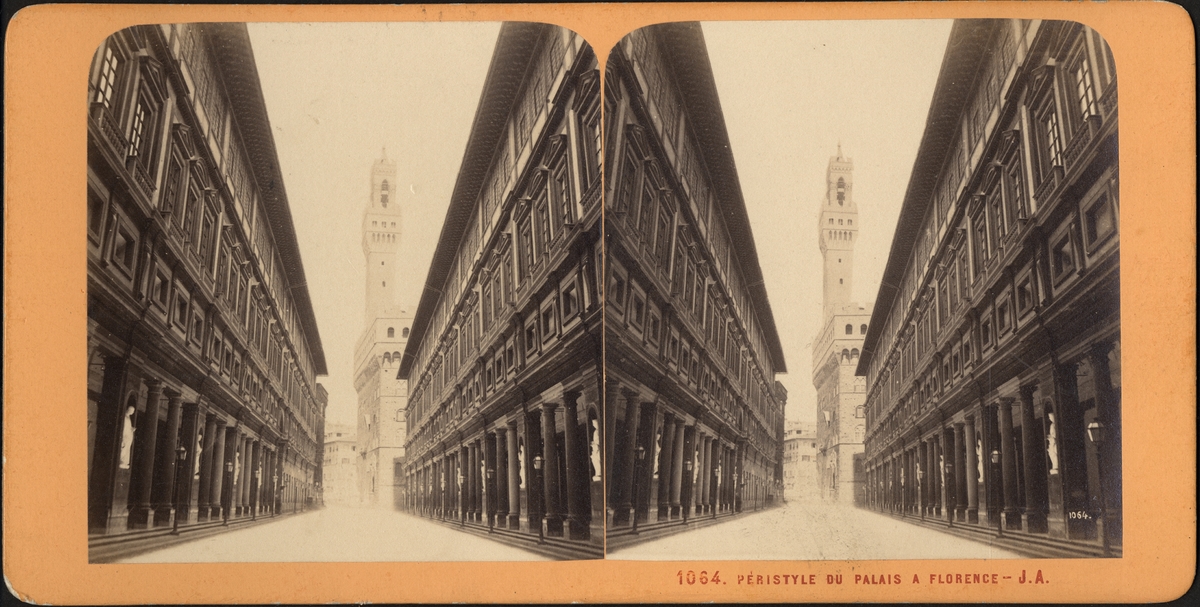 Stereobild av La Galerie des Offices, Florens. I bakgrunden syns Palazzo Vecchio.
