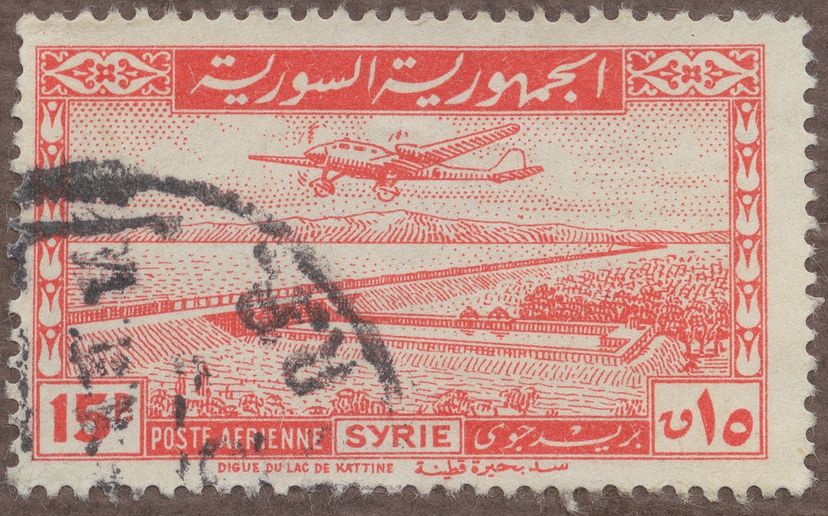 Frimärke från Syrien, 1947. Motiv av Tvåmotorigt monoplan över Dammen vid sjön Kattineh