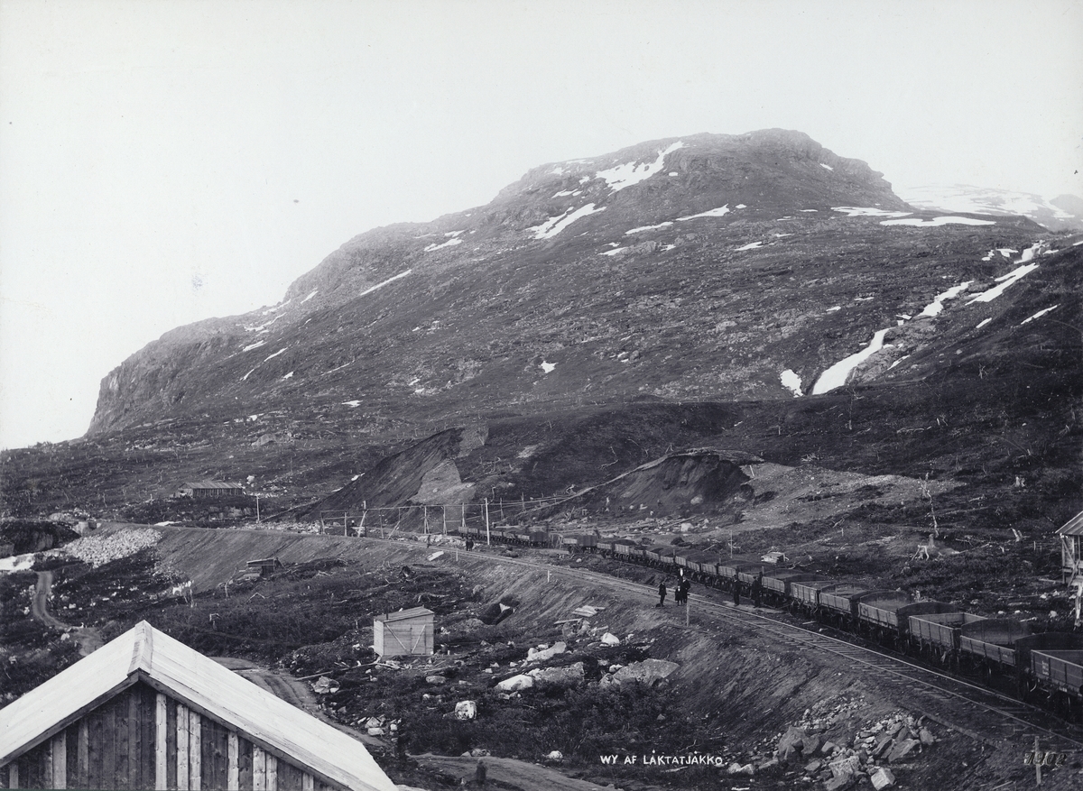 Motiv från Låktatjåkko. Järnvägsspåret skönjes i förgrunden samt det intill belägna grustaget. Bilden vann pris i Svenska Turistförenigens Fotografiska Pristävlan 1902.