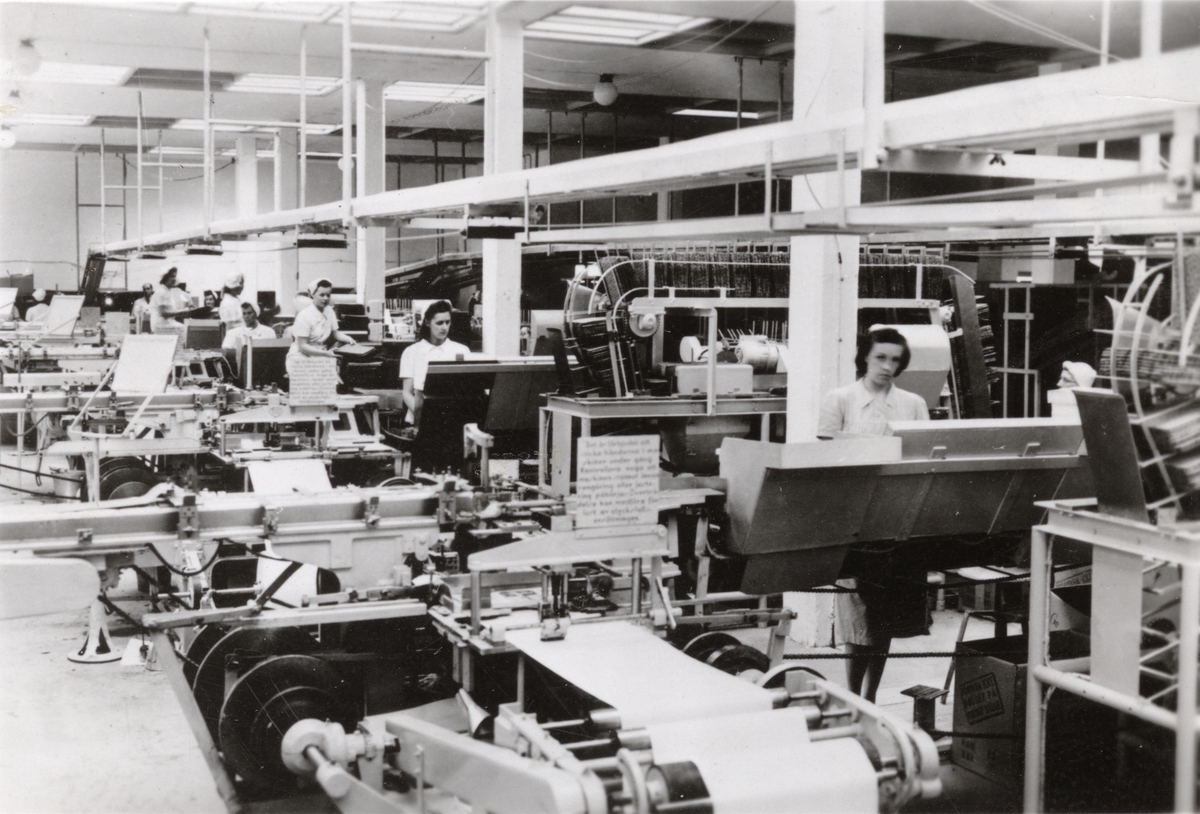 AB Wasa Spisbrödsfabrik, interiör. Brödsågar och paketeringsmaskiner.