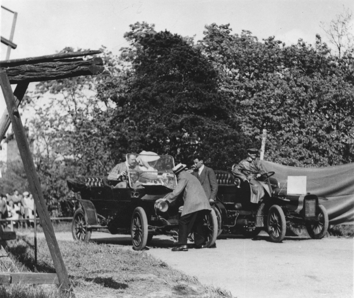 Djurgårdsmässan 1939 på Solliden, Skansen den 21 maj 1939. Från Skådespelet "Grand Prix 1901". T.v. Buick modell 1906 ur Tekniska museets samlingar. Skådespelarna Björn Berglund och Aino Taube i bilden, Alf Augustsson och L. Way-Mathiesen från Tekniska Museet vid sidan. T.h. Cadillac, modell 1905 från general motors Nordiska AB med skådespelare Adolf Witzansky.