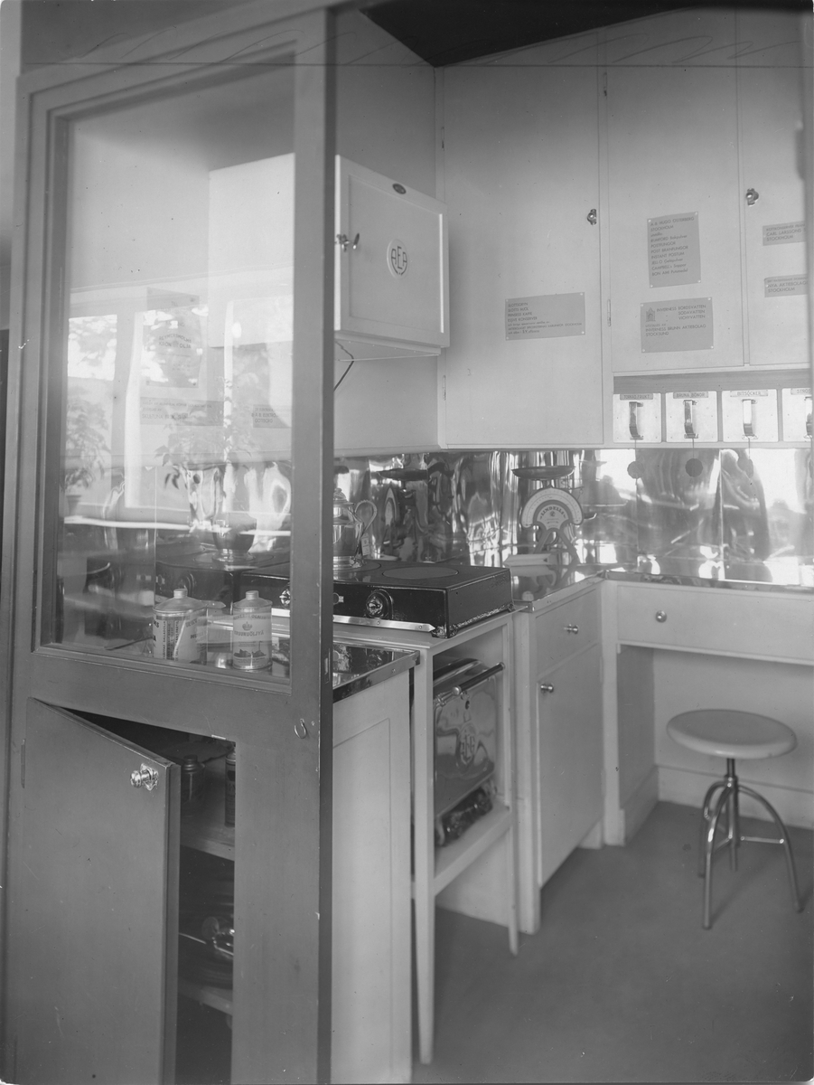 Köksinteriör i egnahemsbostad. Kokvrå i HSB:s lägenhet nr 1. Stockholmsutställningen 1930. Arkitekt Erik Friberger.
