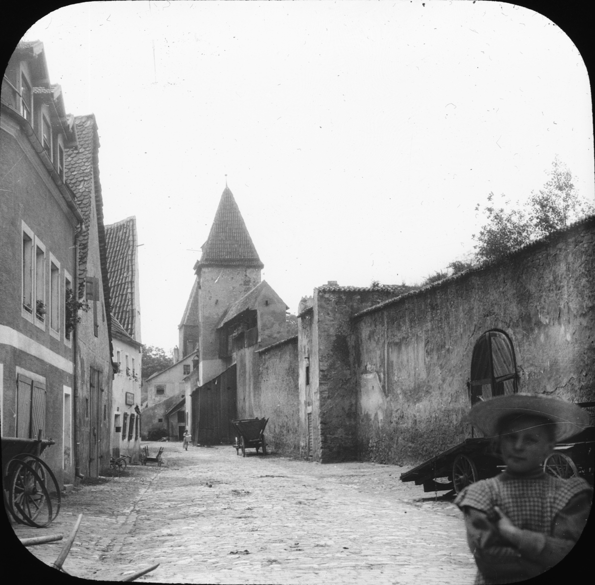 Skioptikonbild med motiv av flicka på gatan Hinter der Mauer vid gamla stadsmuren i Amberg.