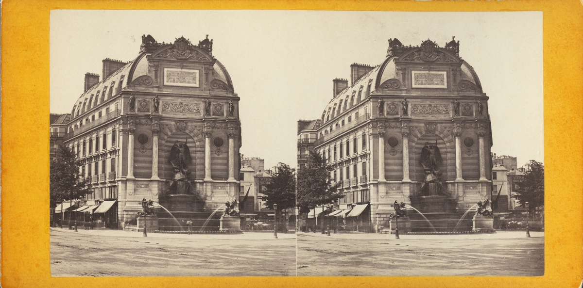 Stereobild med motiv av Fontaine Saint-Michel, en monumental fontän vid Place Saint-Michel, Paris. Den konstruerades 1858-1860 av arkitekten Gabriel Davioud.