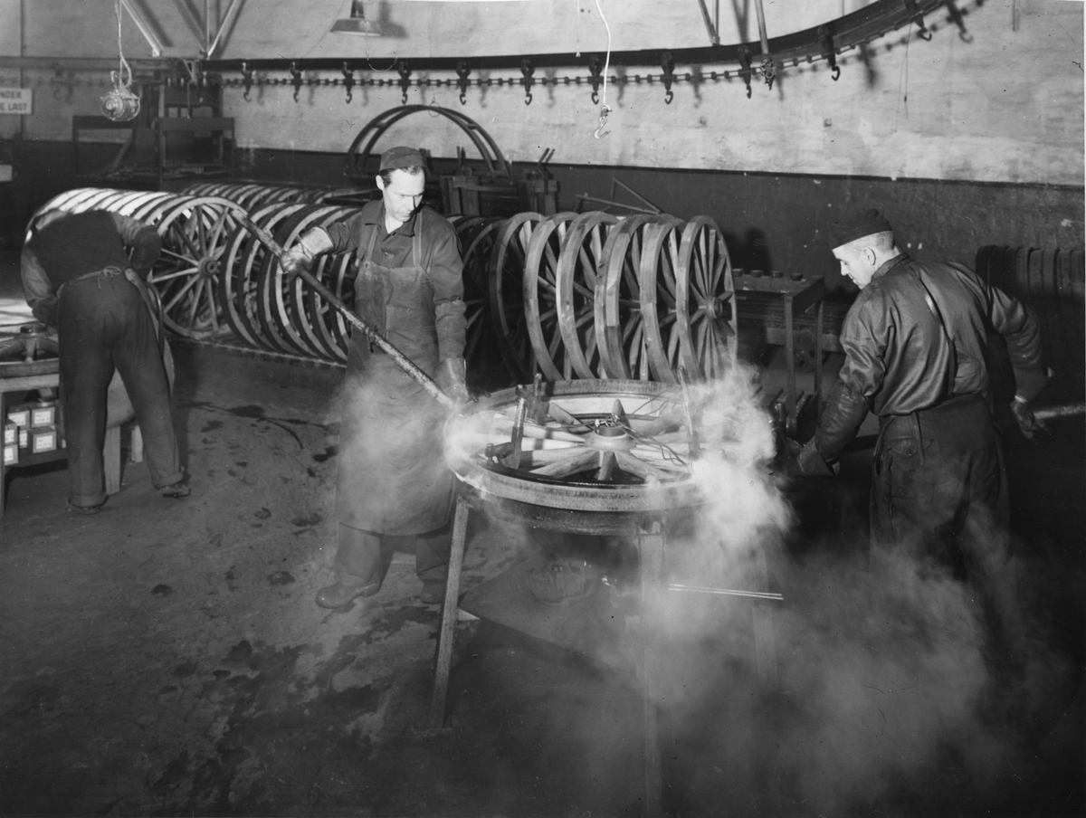 Påkrympning av hjulring på trästommen. För droskkärra.