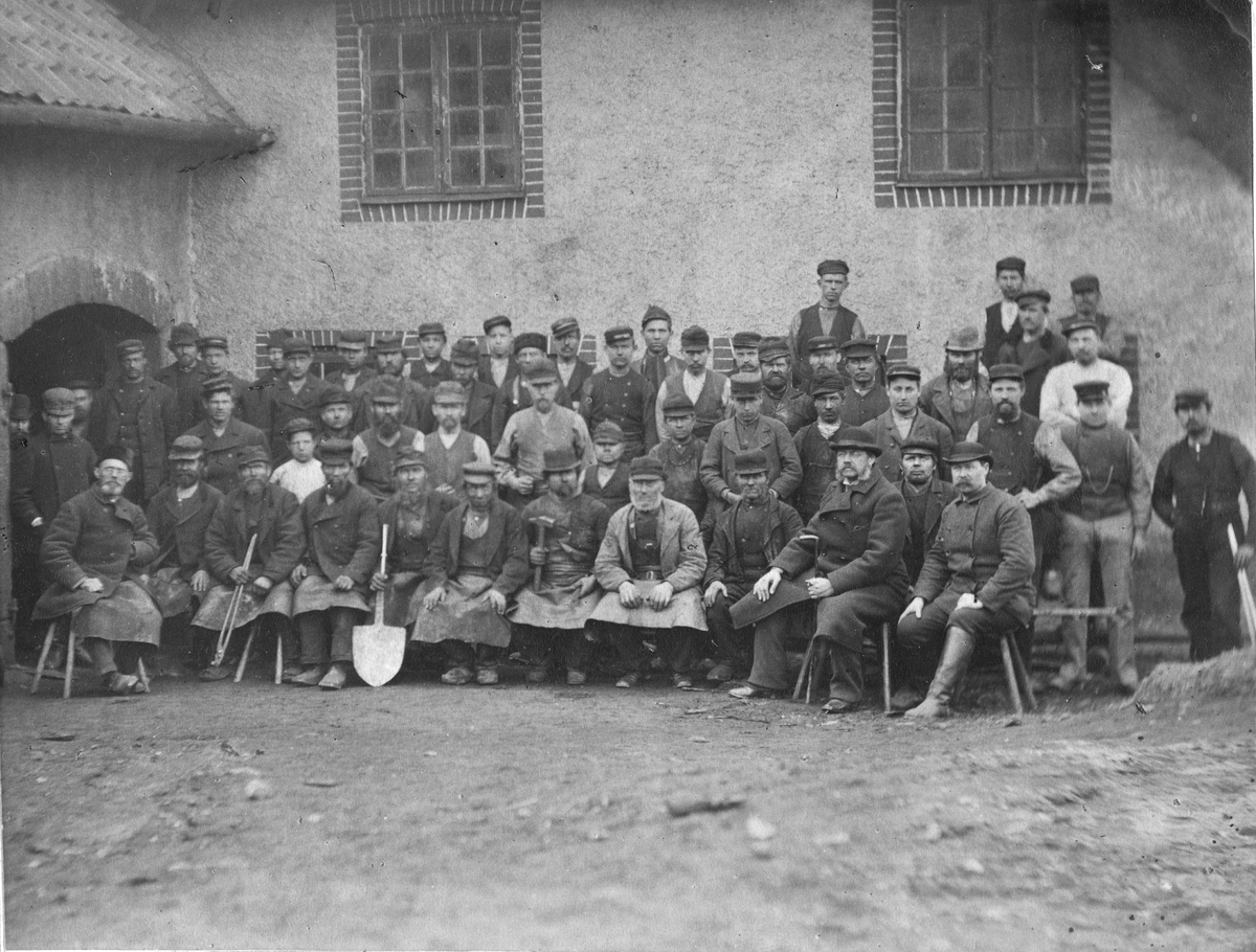 Gruppfotografi av arbetare och ägare vid Wedevågs (Vedevågs) Bruk. Utanför smedjan 1870-talet,