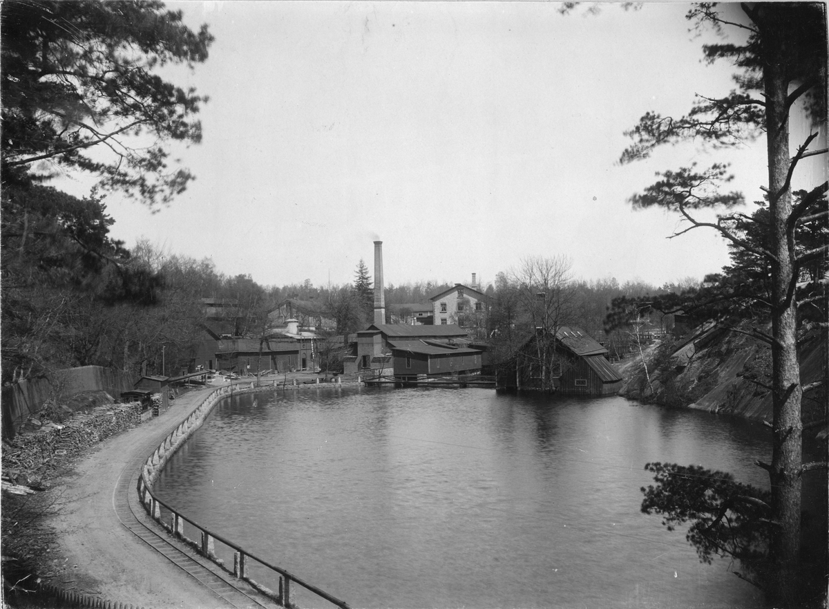 Granefors gamla kopparverk 1896. Från vänster: Kol- och torvhus, gasgeneratorhus, byggnad för kopparugn, asksmälta. Den höga byggnaden är brukskontoret.