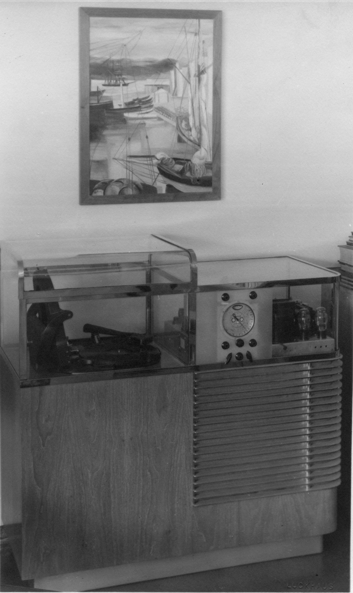 Radiogrammofon konstruerad av Carl Andersson för den kända filmregissören Josef von Sternberg i Hollywood. När man vill komma åt grammofonen rullar man toppen över till radiosidan. De övre delarna är tillverkade av glas med metallfattning.