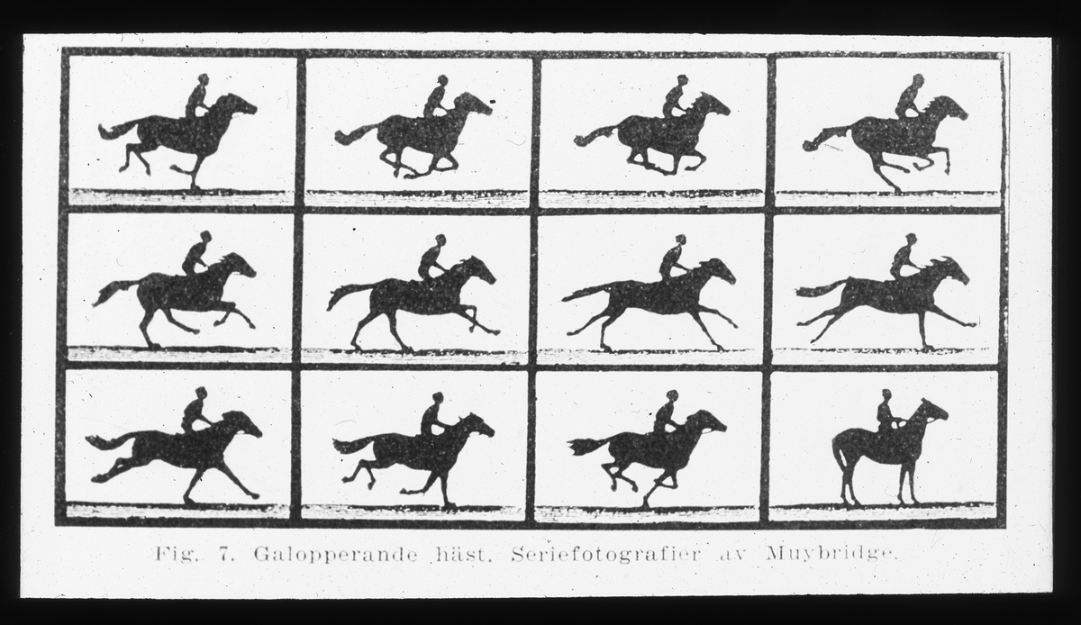 Galopperande häst. Seriefotografier på våtplåtar av E. Muybridge 1877.