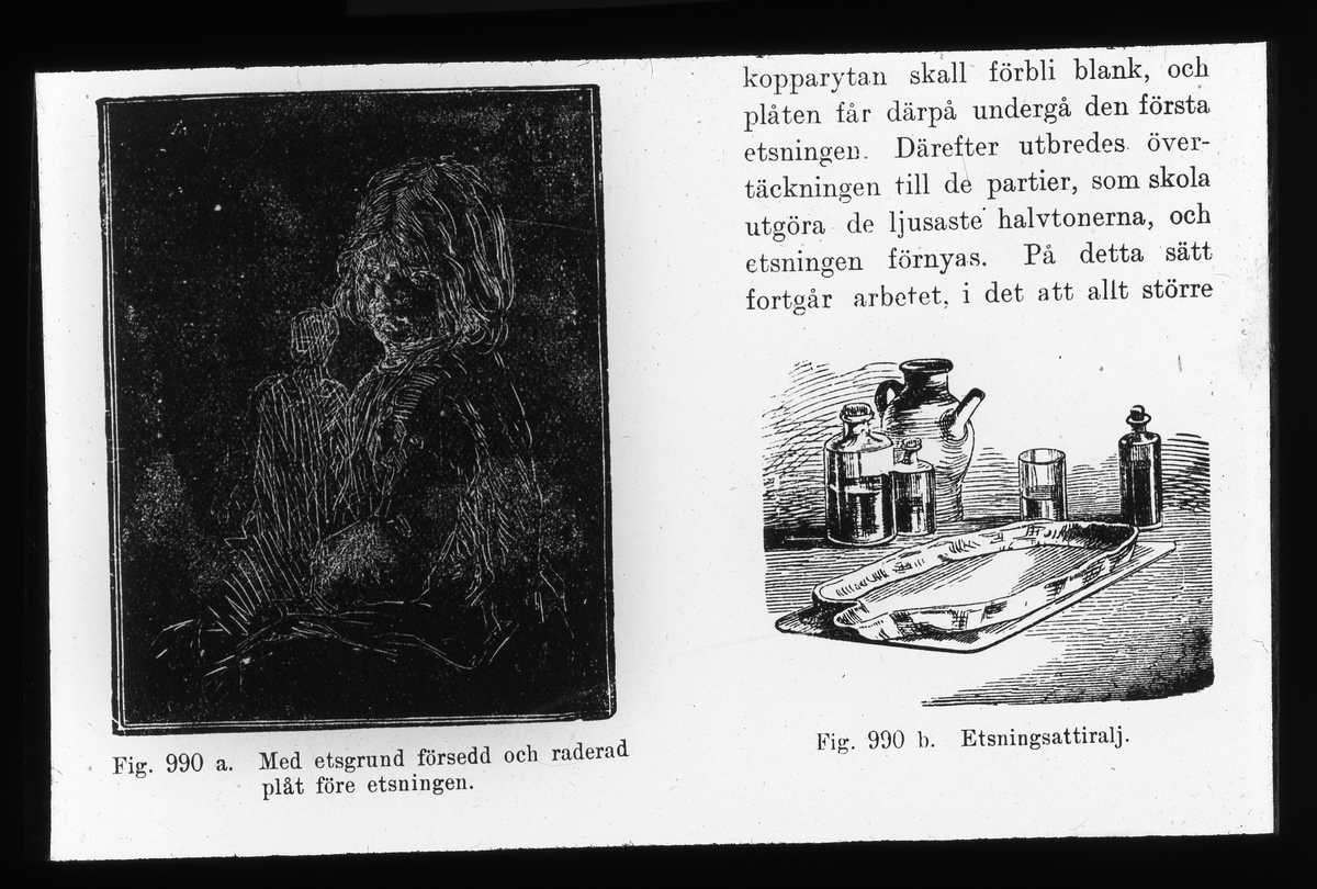 Med etsgrund försedd och raderad plåt före etsningen. + Etsningsattiralj.