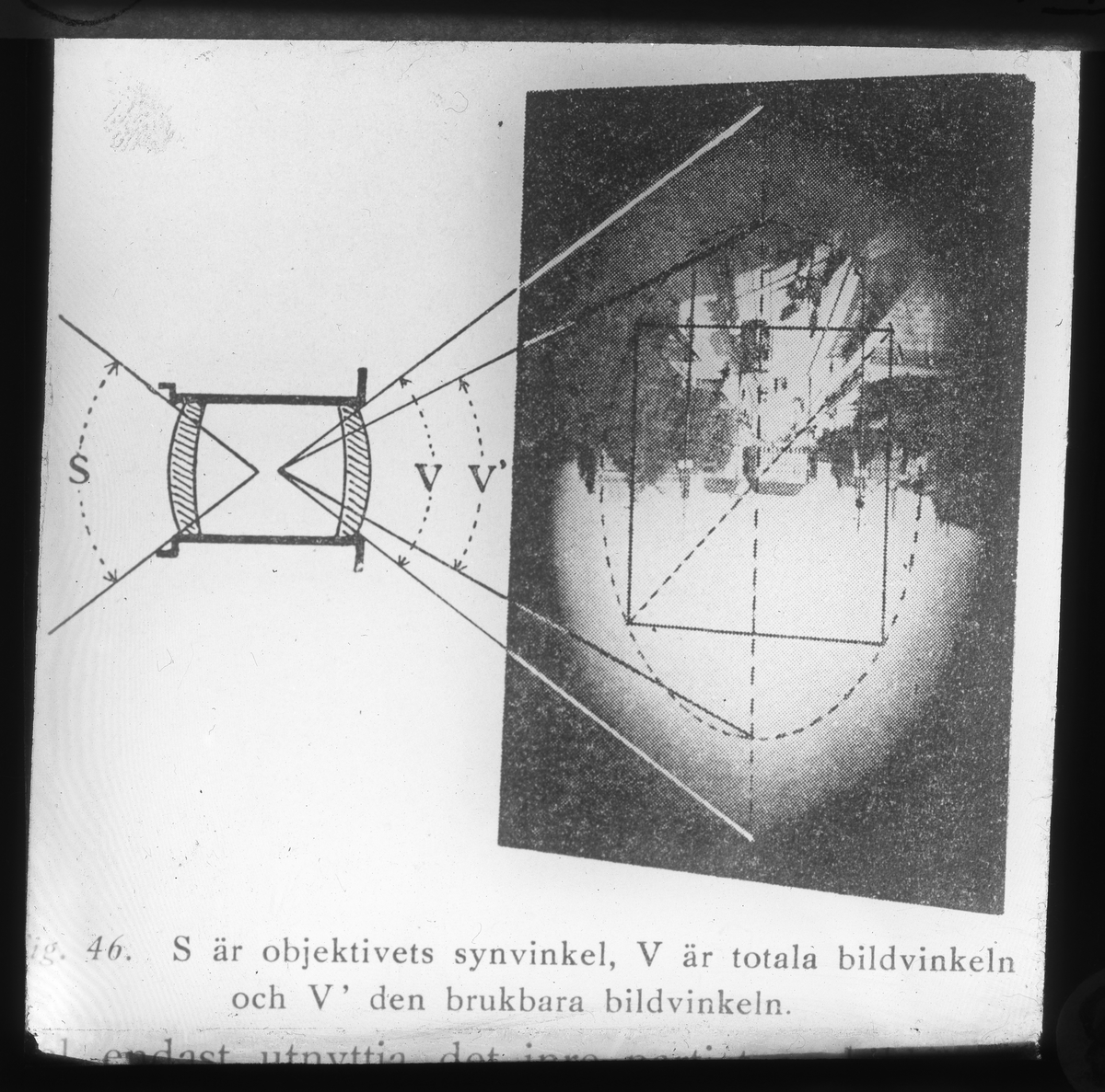Skioptikonbild från Institutionen för fotografi vid Kungliga Tekniska Högskolan. Använd av professor Helmer Bäckström som föreläsningsmaterial. Bäckström var Sveriges första professor i fotografi vid Kungliga Tekniska Högskolan i Stockholm 1948-1958.