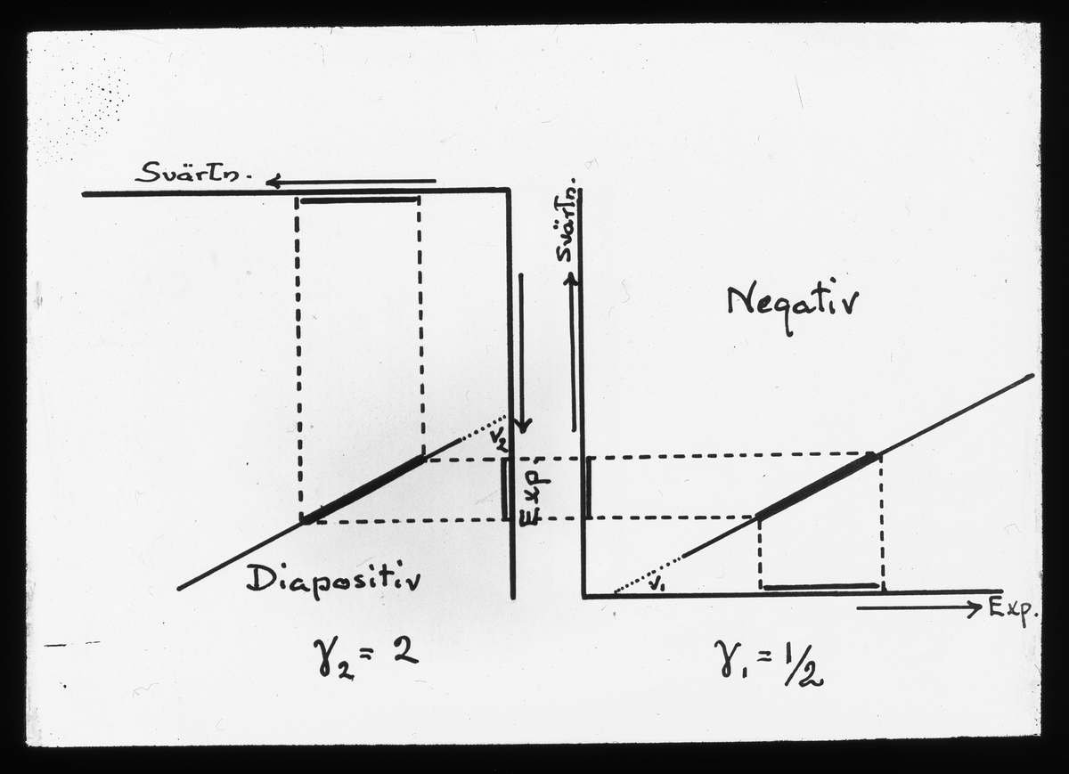 Skioptikonbild från Institutionen för fotografi vid Kungliga Tekniska Högskolan. Använd av professor Helmer Bäckström som föreläsningsmaterial. Bäckström var Sveriges första professor i fotografi vid Kungliga Tekniska Högskolan i Stockholm 1948-1958.