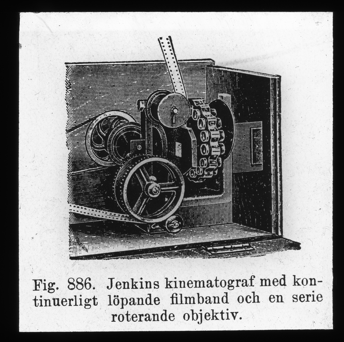 Jenkins kinematograf med kontinuerligt löpande filmband och en serie roterande objektiv.