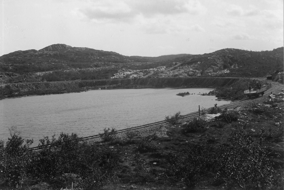 Malmupplag i Kirkenes, Norge. I bakgrunden kan man se att brytningen av järnmalm nyligen påbörjats. Fotografiet ingår i ett album från AB de Lavals Ångturbin, 1909. "The Power Station of Aktieselkabet Sydvaranger i Kirkenes".