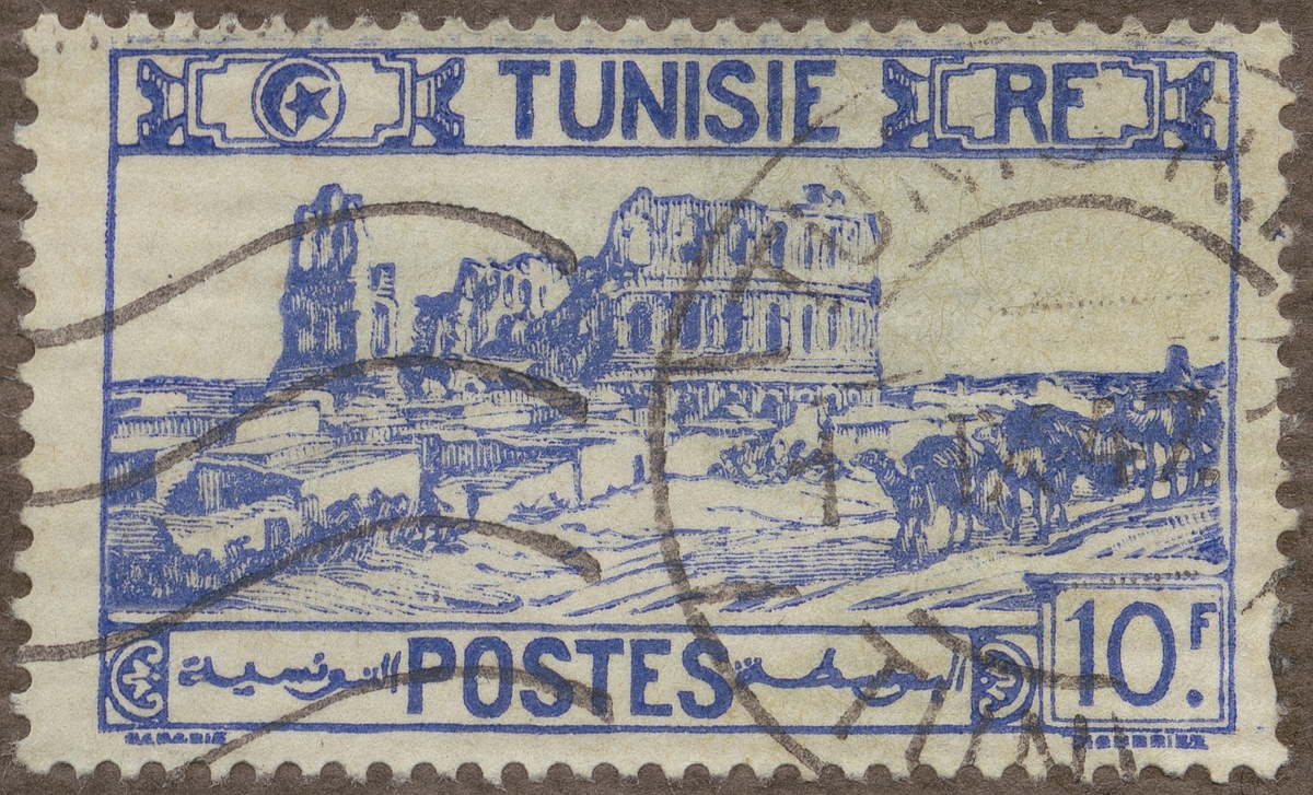 Frimärke ur Gösta Bodmans filatelistiska motivsamling, påbörjad 1950. Frimärke från Tunis, 1925. Motiv av Tunisisk kameltransport framför ruinerna efter amfiteatern El Djene.