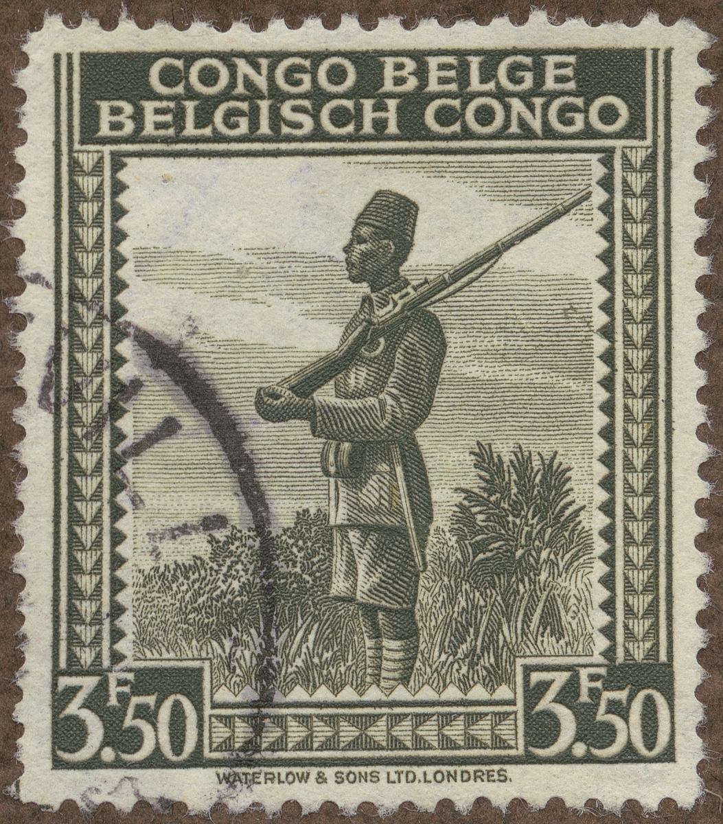 Frimärke från Belgiska Kongo, 1942. Motiv av Vaktpost under gevär