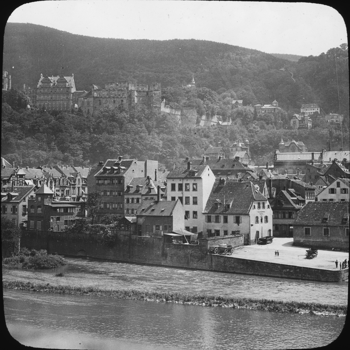 Skioptikonbild med motiv vy över Heidelberg vid floden Neckar. I bakgrunden syns Schloss Heidelberg.