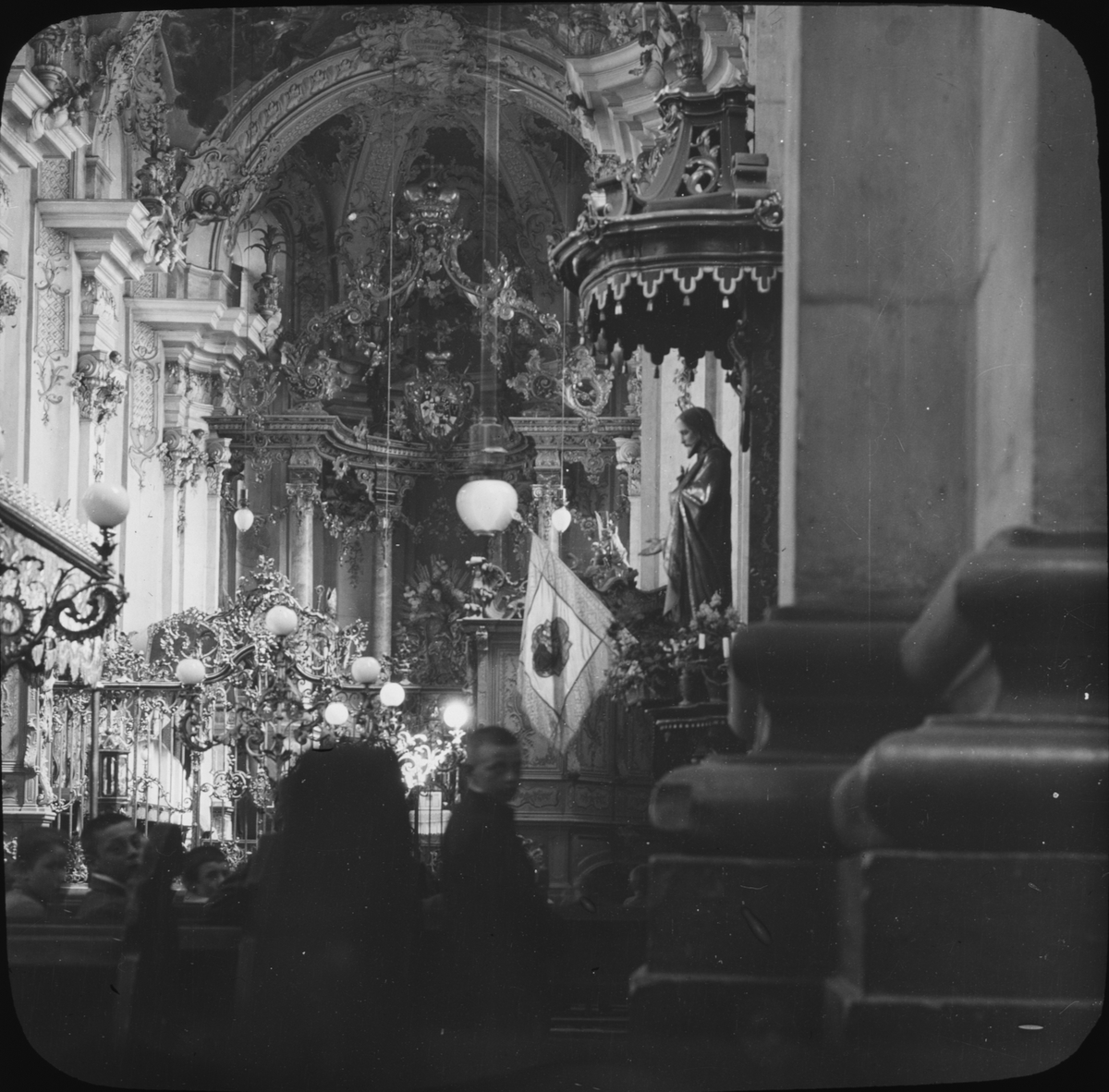 Skioptikonbild med motiv av interiör i kyrka i Trier.