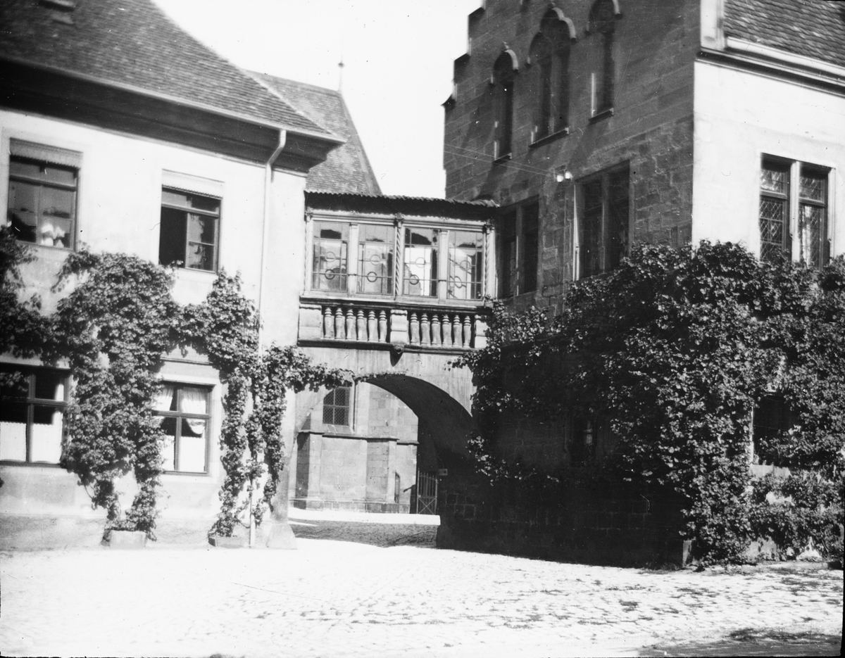 Skioptikonbild med motiv av brygga mellan två hus i Deutschhof, Heibronn.