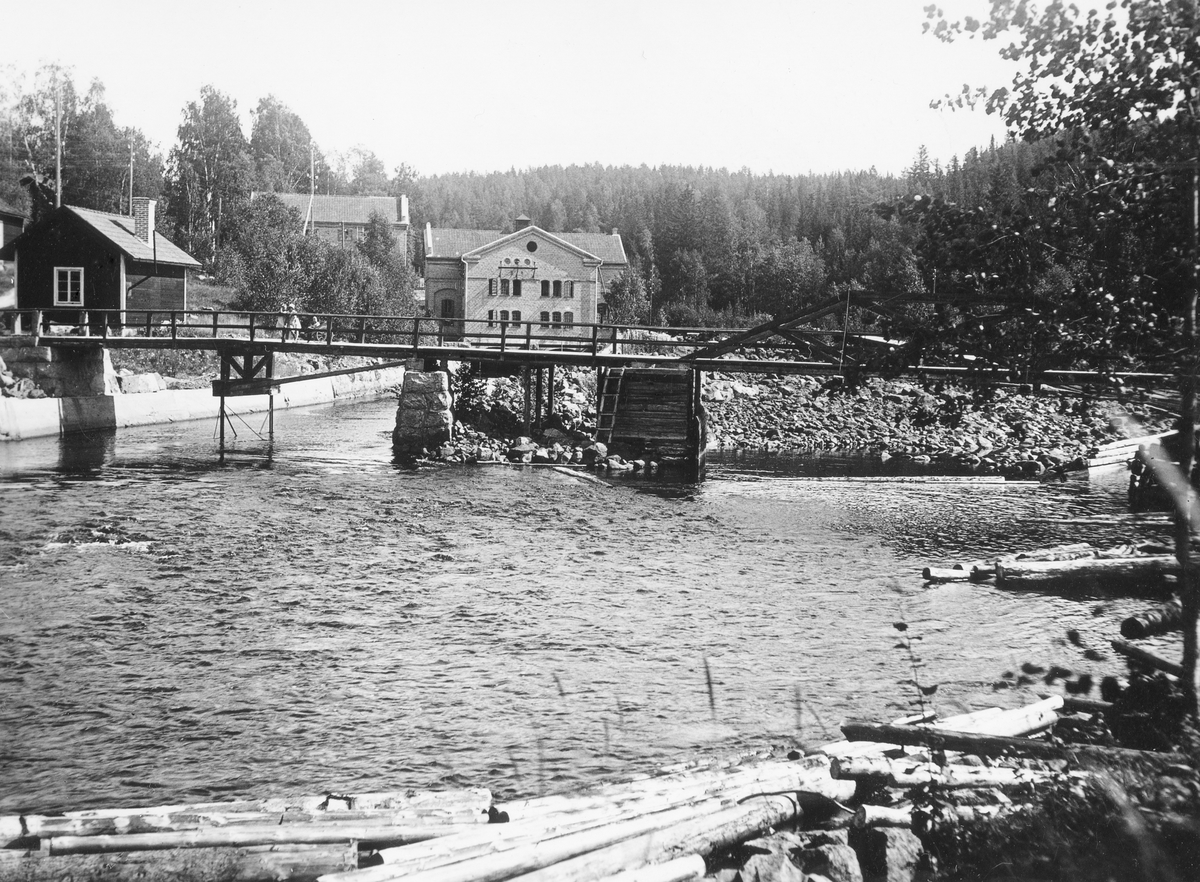 Borgärdets kraftstation. Nedströmsvy av flottningsrännans myning till höger samt körbron över ån.