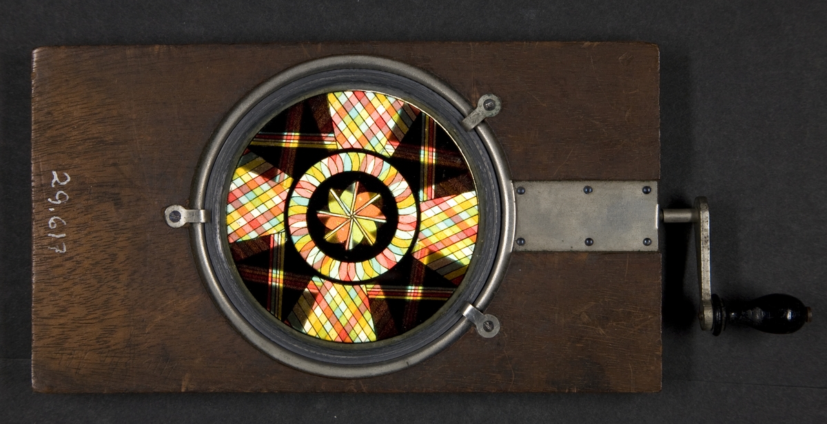 Handmålad bild på glas för skioptikon/laterna magica. Optiskt mönster, vev för att åstadkomma rörelse i bilden.