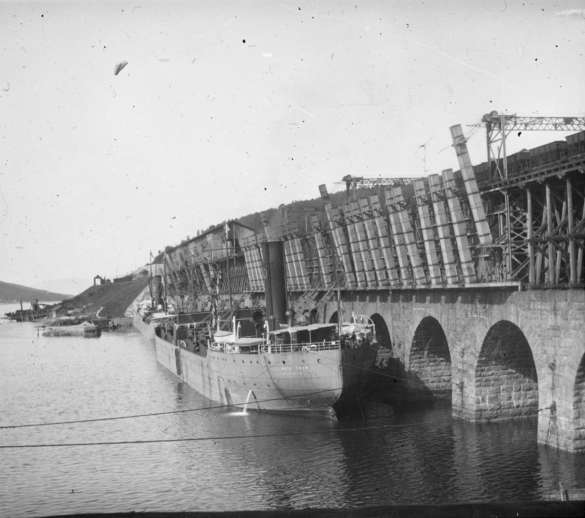 Skioptikonbild med motiv från yrkesinspektionens undersökningar på olika arbetsplatser. Fartyg vid järnvägsbro. Möjligen Narvik, Norge.